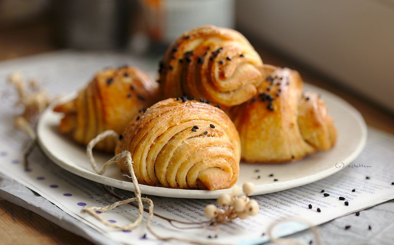 - végül megugrottam a feladatot, az elvékonyított kört 16 fele osztottam, a háromszögeket a csúcsuk felé haladva feltekertem, tepsibe pakolgattam őket nem túl közel egymáshoz, lekentem a maradék tojással a tetejüket, megszórtam fekete hagymamaggal és 50 fokos sütőben nyugton hagytam a kifliket 15 percig, aztán 175 fokon szépen megsültek.